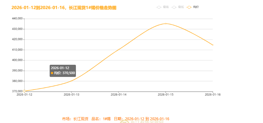 2026年1月12日-16日,据长江有色金属网获悉,长江现货1#锡价走出“开年冲高、尾周回落”的过山车行情:从1月12日370500元/吨的均价起步,连续三日上涨至1月15日435250元/吨的周内高点,单日最大涨幅超2.5万元,1月16日受获利了结情绪拖累,均价回落至414750元/吨,周内振幅超6万元。这一轮剧烈波动背后,是宏观预期、供需博弈与产业链情绪的三重共振,也为下周锡价走势埋下重要伏笔。