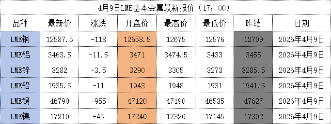 4月9日,LME基本金属市场在宏观消息面的剧烈反复中集体承压。截至北京时间17:00,LME期铜、期铝、期锌、期铅、期锡、期镍全线收跌,其中期锡重挫955美元领跌,期铜下跌118美元,期铝下跌11.5美元。