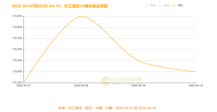 周初(4 月 7 日)清明开市,镍价延续前期弱势,当日均价 135350 元 / 吨,大跌 400 元 / 吨触及周内低点,完成探底企稳。核心驱动为美伊停火协议生变、国内复工初期下游需求疲软,市场观望氛围浓厚,镍价顺势下探。