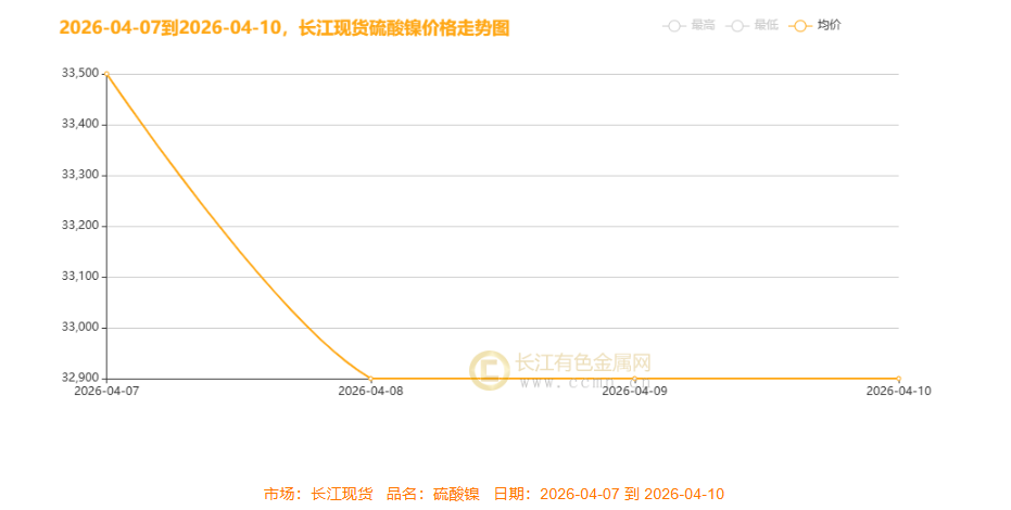 本周长江现货硫酸镍呈急跌后企稳走势:4 月 7 日均价 33500 元 / 吨,4 月 8 日骤降至 32900 元 / 吨,后续两日维持该价位横盘,整体大幅下挫后进入震荡。核心驱动:下游新能源、不锈钢需求疲软,叠加前期获利盘集中了结、供给端产能释放压力,引发价格快速回调,市场观望情绪浓厚,价格暂稳。