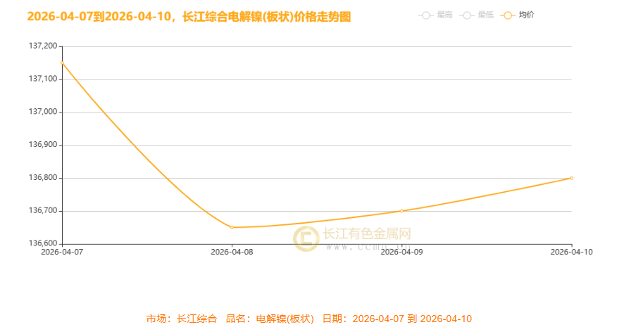 本周长江综合电解镍(板状)呈先抑后扬走势:4 月 7 日均价约 137150 元 / 吨,4 月 8 日急探至 136650 元 / 吨低点,随后两日震荡回升,10 日反弹至 136800 元 / 吨附近。前期获利盘集中了结引发急跌,后续逢低买盘、下游需求预期回暖、宏观情绪修复支撑反弹。