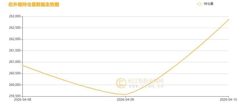 本周伦外镍持仓量呈V 型反转走势:4 月 8 日起震荡回落,4 月 9 日探至阶段低点约 25.95 万手,随后大幅拉升,10 日冲高至近 26.29 万手,全周显著回升。前期获利盘了结减仓致回落,后期镍价反弹预期升温,投机资金大举加仓,看多情绪回暖推升持仓。