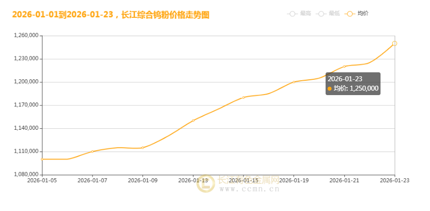 2026年1月23日,长江现货综合钨粉均价报1250000元/吨,较上一交易日大涨25000元,本周累计涨幅达65000元,26年开年至今涨幅已近14%。