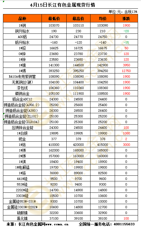 4月15日长江有色金属现货行情